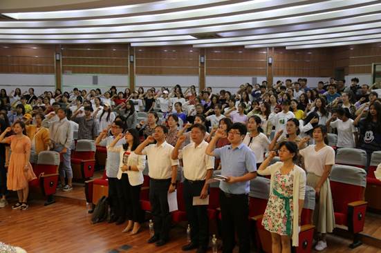 首先在滕婧名的带领下,大家起身宣誓。要学为人师、行为世范,争做未来优秀人民教师!