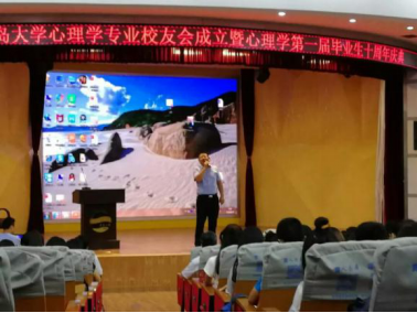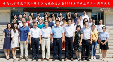 8月25日,青岛大学师范学院心理学系举办了“校友返校日”活动和校友会成立大会暨首届毕业生毕业十周年庆典。活动在师范学院学术报告厅举行,校友办副主任鲍文胜,青岛大学师范学院党委书记宋贵欣,青岛大学(青岛)心理与精神健康研究院院长、师范学院副院长、心理学系主任陶明达,心理学系老领导周东明主任、陈国江书记、丛红群书记等出席并发表致辞,心理学系全体在校师生参加了本次盛会。