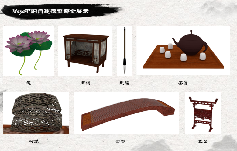 作品由19级杨舒童、张磊与20级张萌、郭凤琳、于怡共同完成。作品使用Maya建模和Unity虚拟现实交互技术,制作汉语学习辅助工具,弘扬中华传统文化。以古代庭院虚拟场景漫游为主要呈现形式,按键控制角色的运动以及鼠标悬停识别物体并伴随语音讲解,寓学于乐,有利于学生进行探究性学习。