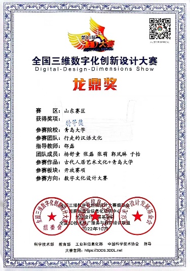 日前,全国三维数字化创新设计大赛(简称全国3D大赛)山东赛区比赛在聊城大学举行,户外直播 教育技术专业邵磊老师指导作品《古代人居艺术文化》获得数字文化赛项特等奖,成功进入全国三维数字化创新设计决赛。