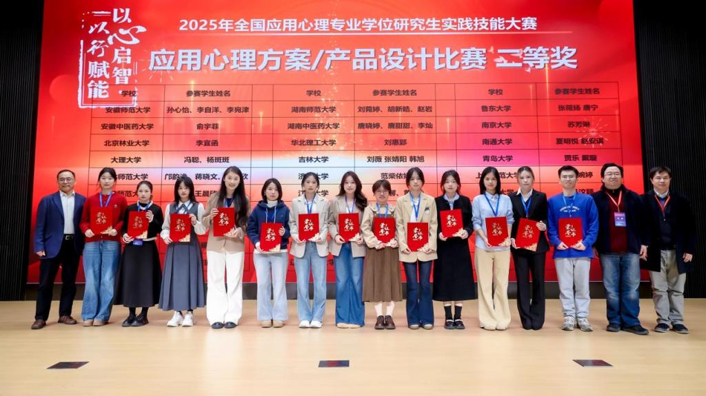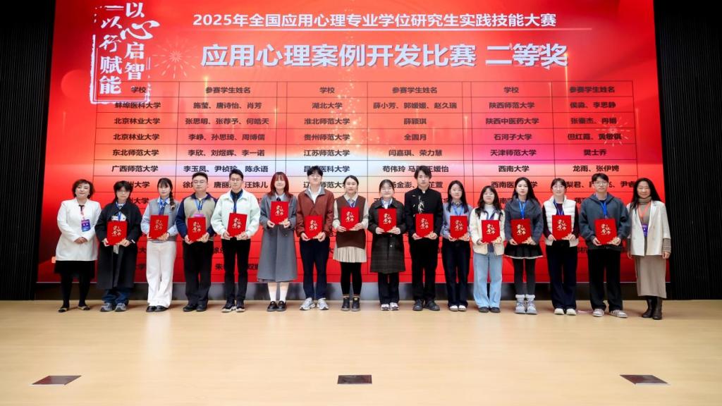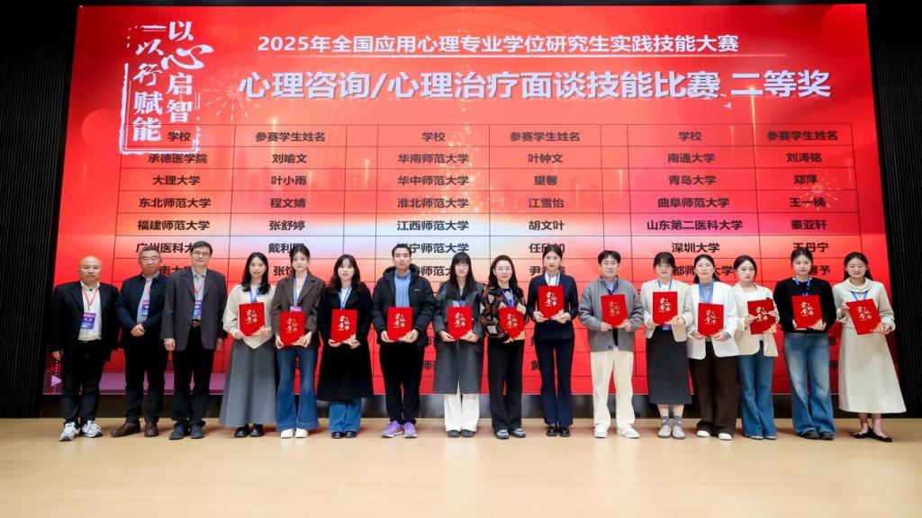 经过决赛现场的激烈角逐,张克顺老师指导的学生徐一婷、王苗睿在心理科普作品创作赛道获全国二等奖,魏星老师指导的肖璐璐、闫婷婷、李昕同学在应用心理案例开发赛道获全国二等奖;蔡晨老师指导的学生郑萍在心理咨询/心理治疗面谈技能赛道获全国二等奖,李天碧老师指导的学生贾乐、戴璇在应用心理方案/产品设计赛道获全国二等奖。