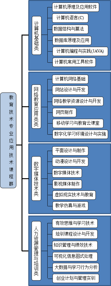 本专业学生除按规定完成青岛大学通识教育课程和学科基础课程外,专业应用课程设置主要是“计算机基础类、网络教育应用类、数字媒体技术类和人力资源管理与培训类”四大课程群,各课程群即独成体系又相互协同,为实现“双重专业基础、多元领域发展”的培养目标提供保证。具体课程体系见下页图。
